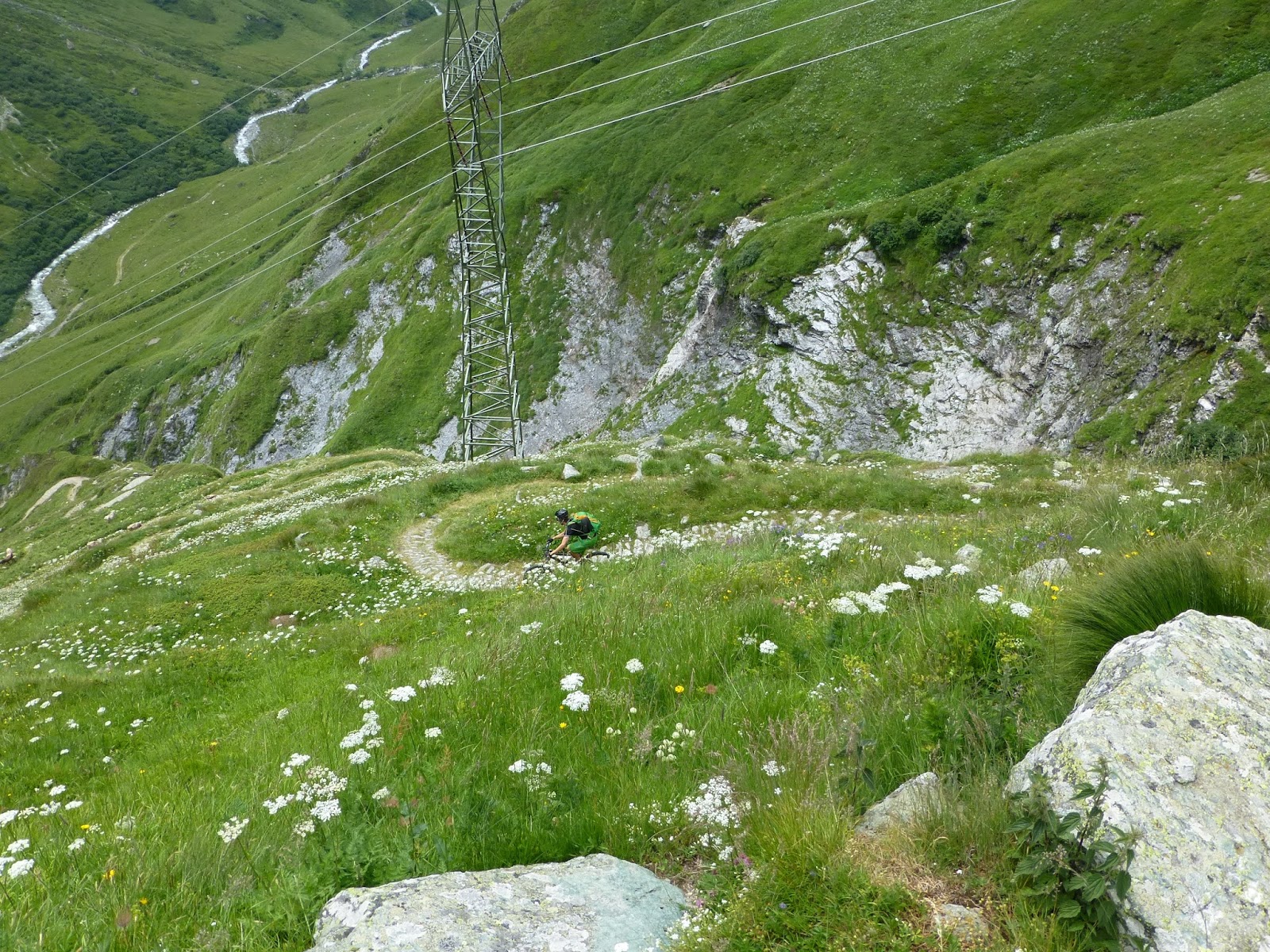 5. Tag. Durch die urige Bregaglia. Nach einer morgentlichen Gratisfahrt mit den Savogniner Bergbahnen und einem harmlosen Bikepark-Ritt, schwindelten wir uns postbus-mäßig 500hm hoch nach Bivio und starteten von dort unsere heutige Tour zur Alpensüdseite über den Pass de Sett (Septimberpass). Einer angenehmen Auffahrt auf Almwegen, folgte ein schwieriger verblockter Weg hinunter ins Tal.